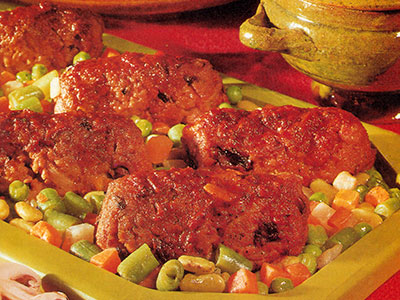Se pasan las albóndigas a una fuente, se cubren con toda la salsa y se adornan con todas las verduras. Se sirve bien caliente.