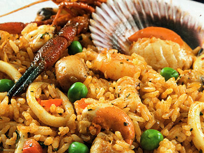 La siguiente receta indica cómo preparar un delicioso "arroz con mariscos", añada hojas de laurel y un chorrito de vino blanco al arroz, durante su cocción.