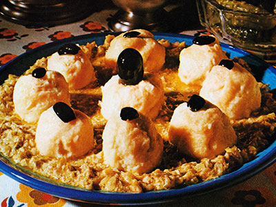 Con esta mezcla se van haciendo las albóndigas, se rebozan en harina y huevo batido, friéndolas en abundante aceite caliente.
