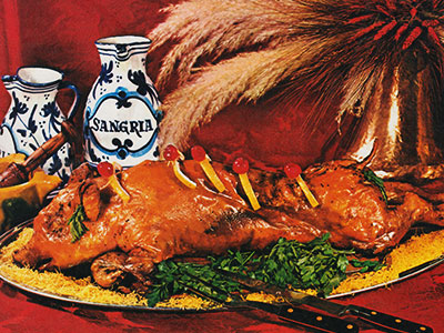 Se presenta en la misma cazuela o en una gran fuente; se le coloca en la boca un tomate, una manzana o una zanahoria.