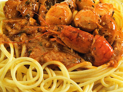 Verifique la sazón, cuando rompa el hervor incorpore los mariscos reservando para el final las conchas que se agregan junto con el queso parmesano. De vuelta y sirva sobre los fideos cocidos al dente acompañado con queso rallado.