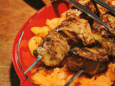 Se corta el hígado en trozos cuadrados y el tocino en trozos más finos, ensartándolos en las brochetas; empezando con el hígado y alternándolo con el tocino.