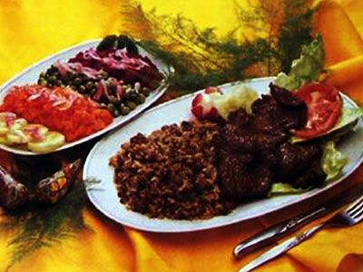 Se sirve con una buena porción de carne asada, acompañada de ensalada de remolacha.