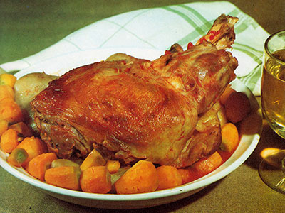 La carne se sazona con los ajos machacados y perejil, dejándola reposar una media hora; después se espolvorea de sal, colocándola en un asador con aceite o manteca de cerdo; se rocía con un vasito de vino blanco y se mete en el horno medio fuerte; de vez en cuando se rocía con zumo de limón y agua.